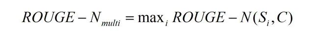 如果给定多个参考译文 Si,Chin-Yew Lin 也给出了一种计算方法,假设有 M 个译文 S1, ..., SM。ROUGE-N 会分别计算机器译文和这些参考译文的 ROUGE-N 分数,并取其最大值,公式如下。这个方法也可以用于 ROUGE-L,ROUGE-W 和 ROUGE-S。