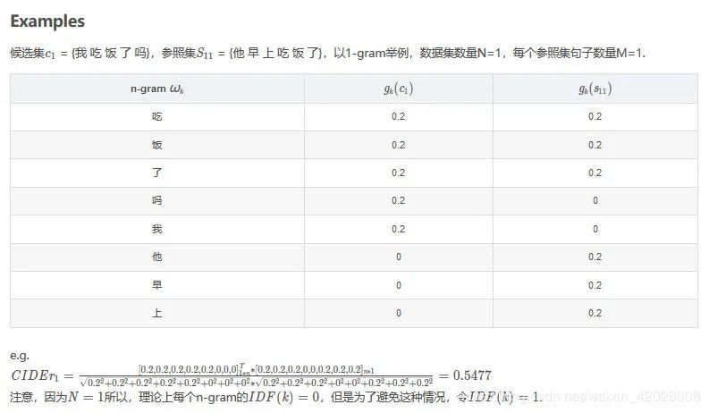 CIDEr 是专门设计出来用于图像标注问题的。这个指标将每个句子都看作“文档”,将其表示成 Term Frequency Inverse Document Frequency(tf-idf)向量的形式,通过对每个n元组进行(TF-IDF) 权重计算,计算参考 caption 与模型生成的 caption 的余弦相似度,来衡量图像标注的一致性的。