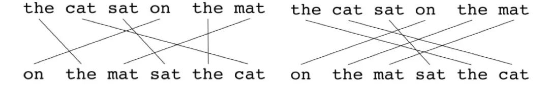 所谓平面图 ,就是1元组之间的映射集。平面图有如下的一些限制:在待评价翻译中的每个1元组必须映射到参考翻译中的1个或0个一元组,然后根据这个定义创建平面图。如果有两个平面图的映射数量相同,那么选择映射交叉数目较少的那个。 也就是说,上面左侧平面图会被选择。状态会持续运行,在每个状态下只会向平面图加入那些在前一个状态中尚未匹配的1元组。一旦最终的平面图计算完毕,就开始计算METEOR得分: