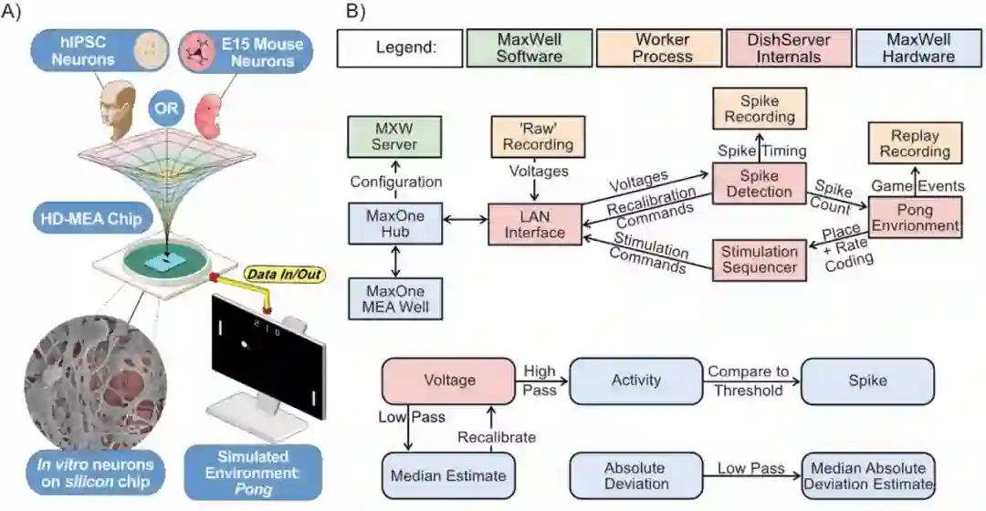 下图 A 为 DishBrain 装置的概览图。此外,DishBrain 环境是一个与 MaxOne 软件交互的低延迟实时系统,使得应用时可以扩展其原始功能,下图 B 即为 DisBrain 闭环系统中的软件组件和数据流。