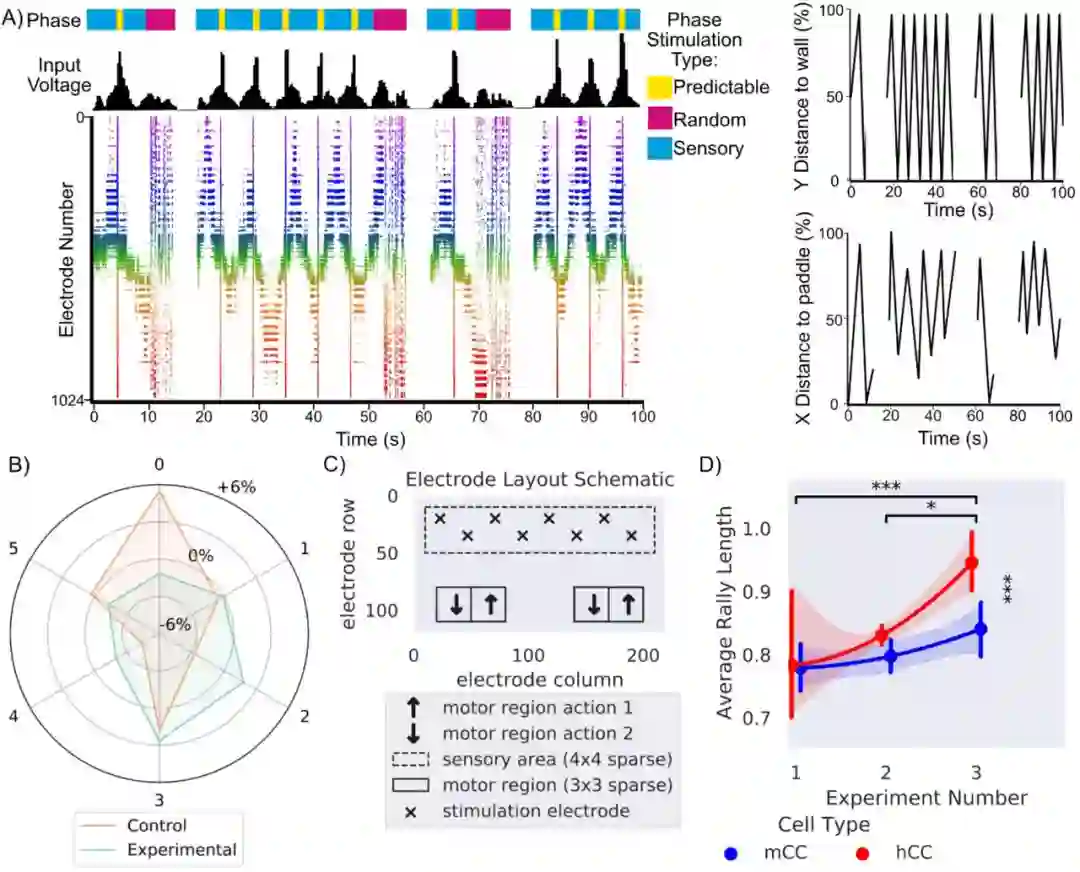 在游戏启动后,系统会向微电极阵列的左边或右边发送电子信号来指示球的位置。迷你大脑则会激发自己的神经元,根据球的位置来回移动球拍。
