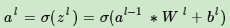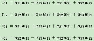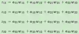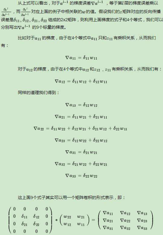 假设l−1层的输出al−1是一个3x3矩阵,第l层的卷积核Wl是一个2x2矩阵,采用1像素的步幅,则输出zl是一个2x2的矩阵。我们简化都是bl都是0,则有