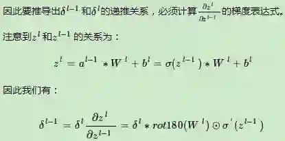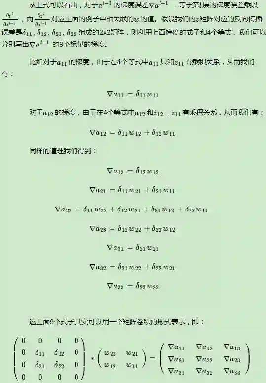 3) 卷积层是通过张量卷积,或者说若干个矩阵卷积求和而得的当前层的输出,这和DNN很不相同,DNN的全连接层是直接进行矩阵乘法得到当前层的输出。这样在卷积层反向传播的时候,上一层的δl−1递推计算方法肯定有所不同。