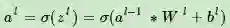 现在已经可以递推出每一层的梯度误差δl了,对于全连接层,可以按DNN的反向传播算法求该层W,b的梯度,而池化层并没有W,b,也不用求W,b的梯度。只有卷积层的W,b需要求出。注意到卷积层z和W,b的关系为: