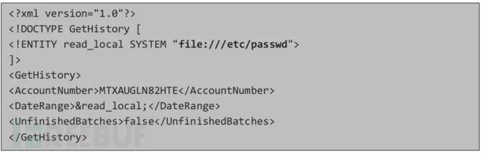 返回的响应是无效的输入错误,因此服务器有一个反射点来显示注入的payload,因为XML请求是用户提供的,我测试了基本的XML注入,通过尝试使用注入实体提取文件来检查应用程序的XML处理方法,将读取远程文件回显在客户端。此攻击的思路是声明外部通用实体并引用网络资源或本地的内部文件: