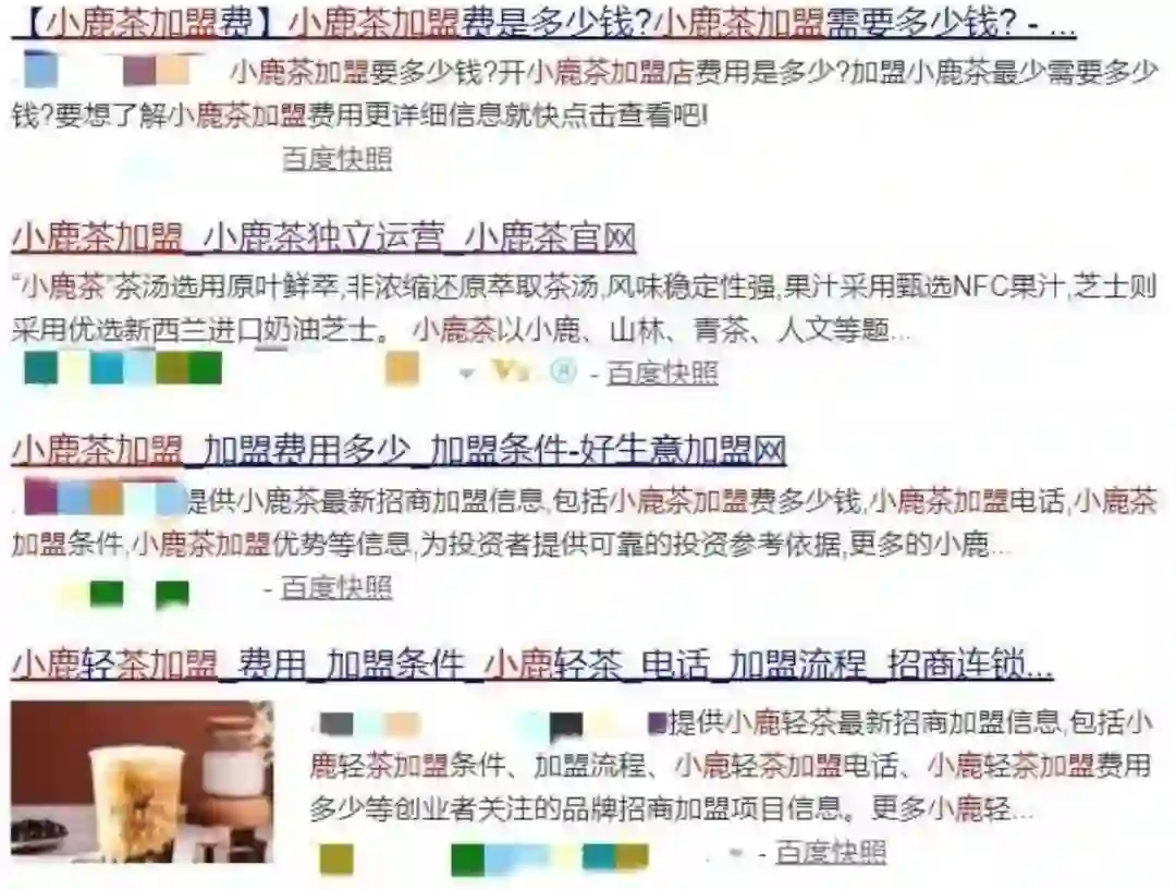 随便搜个奶茶品牌,正牌官网都是掩盖在各种山寨加盟信息之下的。不管什么品牌都可以一股脑放上去,几乎没有审核可言。就是我们这种天天研究奶茶行业的,也免不了看走眼。这不,最近小鹿茶的加盟信息就一搜一大把了。