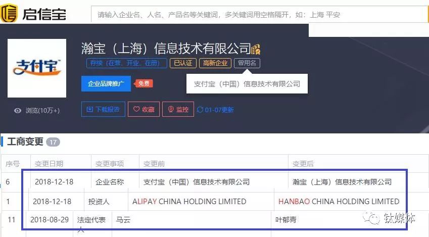 “支付宝”更名“瀚宝”,法人从马云变更为叶郁青