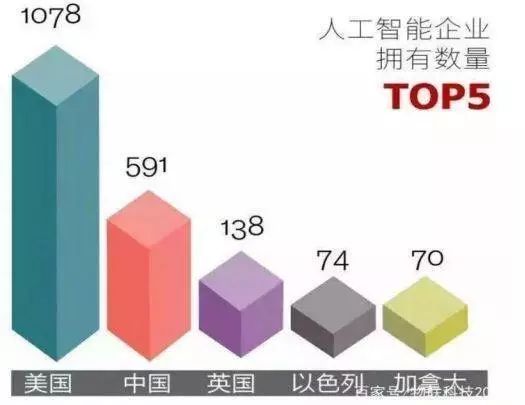 截至2017年6月,全球人工智能初创企业共计2617家。美国占据1078家居首,中国以592家企业排名第二,其后分别是英国,以色列,加拿大等国家。