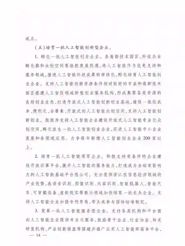 2.培育一批人工智能领军企业。积极支持有条件的企业建设开放计算平台,提升人工智能的服务能力,打造成为全球有影响力的人工智能基础平台性公司。充分发挥浙江在信息经济领域的产业优势,在语音识别、图像识别、内容识别、智能机器人、智能汽车、可穿戴设备、虚拟现实等新兴领域加快培育一批龙头企业。支持人工智能企业加强专利布局,牵头或参与国际标准制定。