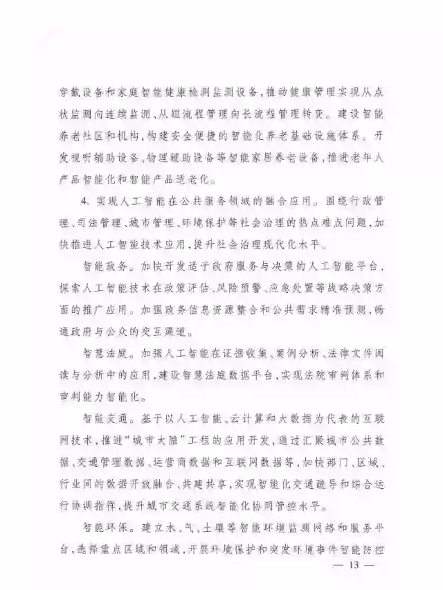 4.实现人工智能在公共服务领域的融合应用。围绕行政管理、司法管理、城市管理、环境保护等社会治理的热点难点问题,加快推进人工智能技术应用,提升社会治理现代化水平。