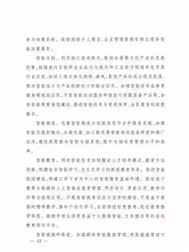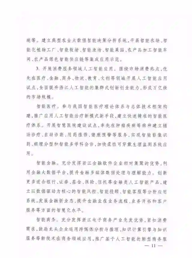 3.开展消费服务领域人工智能应用。围绕市场消费热点,优先在医疗、金融、商务、物流、教育、文创等领域开展人工智能应用试点,全面提升浙江人工智能的集群式创新创业能力,形成万亿级的市场规模。