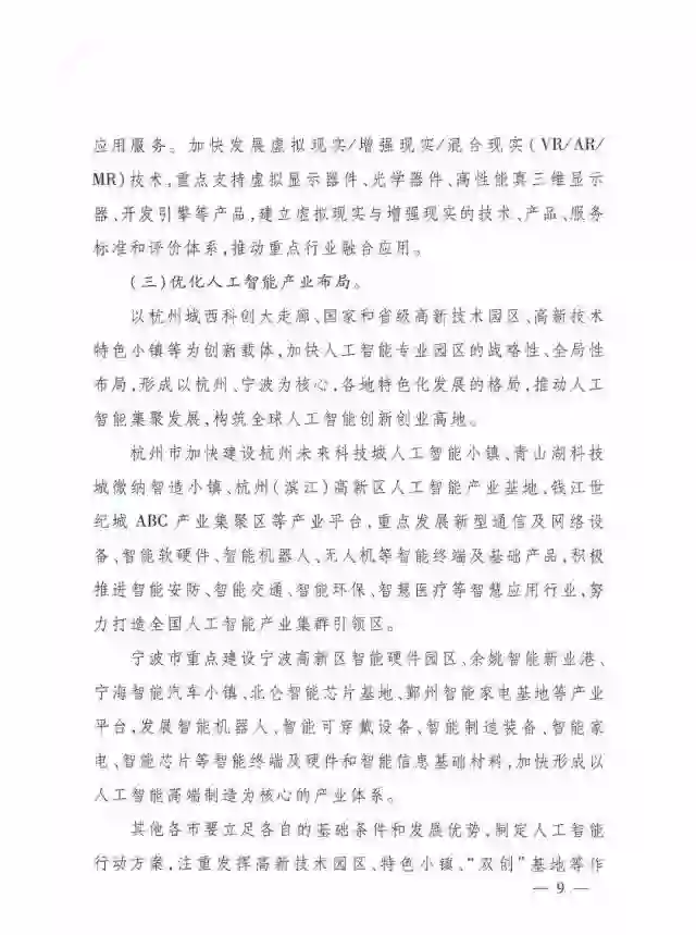 以杭州城西科创大走廊、国家和省级高新技术园区、高新技术特色小镇等为创新载体,加快人工智能专业园区的战略性、全局性布局,形成以杭州、宁波为核心,各地特色化发展的格局,推动人工智能集聚发展,构筑全球人工智能创新创业高地。