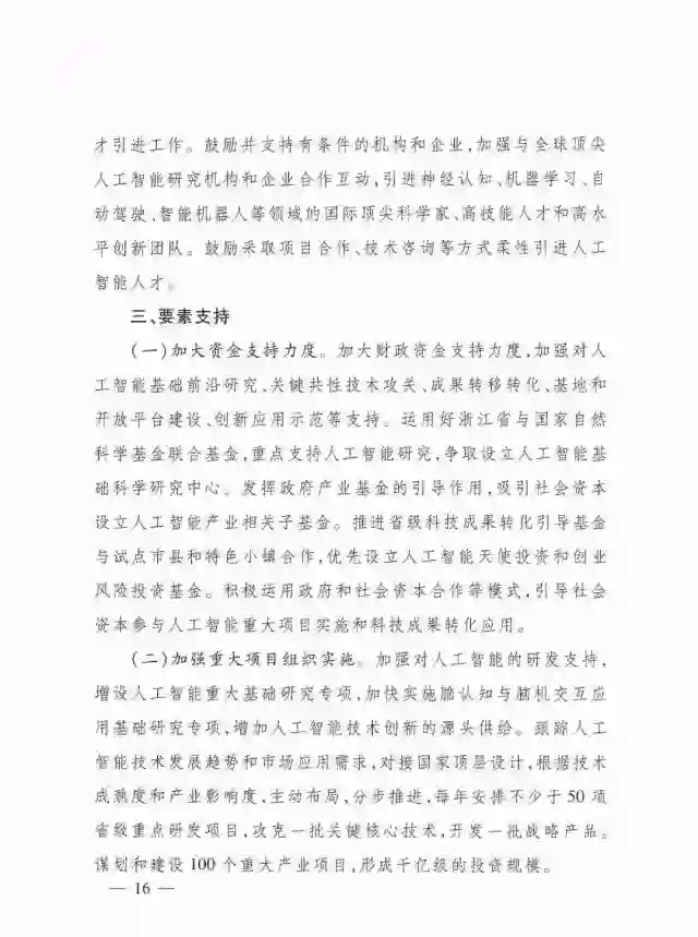 (二)加强重大项目组织实施。加强对人工智能的研发支持,增设人工智能重大基础研究专项,加快实施脑认知与脑机交互应用基础研究专项,增加人工智能技术创新的源头供给。跟踪人工智能技术发展趋势和市场应用需求,对接国家顶层设计,根据技术成熟度和产业影响度,主动布局,分步推进,每年安排不少于50项省级重点研发项目,攻克一批关键核心技术,开发一批战略产品。 谋划和建设100个重大产业项目,形成千亿级的投资规模。