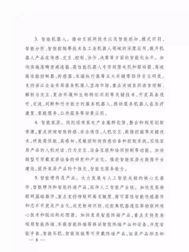 3.智能机器人。推动互联网技术以及智能感知、模式识别、智能分析、智能控制等技术在工业机器人领域的深度应用,提升机器人产品在传感、交互、控制、协作、决策等方面的智能化水平。加快实施高精密减速器、高性能机器人专用伺服电机和驱动器、高速高性能控制器、传感器、末端执行器等五大关键零部件自主研发。支持浙江企业布局服务机器人蓝海市场,重点突破自然语言理解、解析与交互、复杂环境和生物特征识别等关键技术,开发具备视听、交流、判断和行为能力的服务机器人,推动服务机器人在医疗康复、家庭服务、公共务等场景应用。