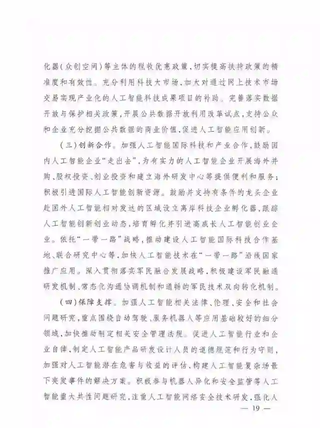 (三)创新合作。加强人工智能国际科技和产业合作,鼓励国内人工智能企业“走出去”,为有实力的人工智能企业开展海外并购、股权投资、创业投资和建立海外研发中心等提供便利和服务;积极引进国际人工智能创新资源。鼓励并支持有条件的龙头企业赴国外人工智能相对发达的区域设立离岸科技企业孵化器,跟踪人工智能创新创业动态,培育孵化并引进高成长人工智能创业企业。依托“一带一路”战略,推动建设人工智能国际科技合作基地、联合研究中心等,加快人工智能技术在“一带一路”沿线国家推广应用。深入贯彻落实军民融合发展战略,积极建设军民融通研发机制、常态化沟通协调机制和通畅的军民技术双向转化机制。
