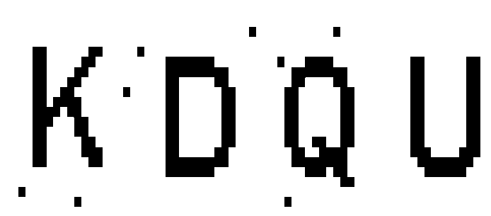 这张图是一个典型的验证码图片,里面有“KDQU”四个字母,也有后方很多的灰色线条干扰。首先思考一下,当我们的眼睛看到这张图的时候,你的大脑是如何对这几个字母进行识别的。过程大致是这样的: