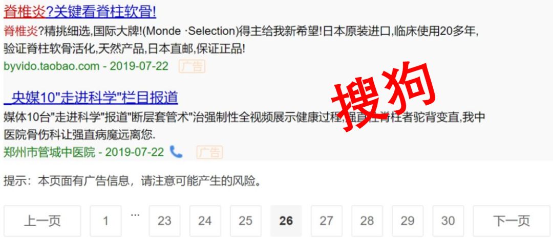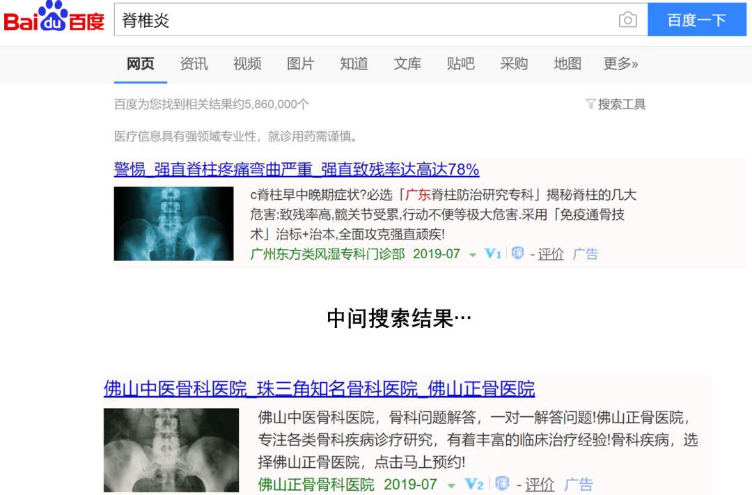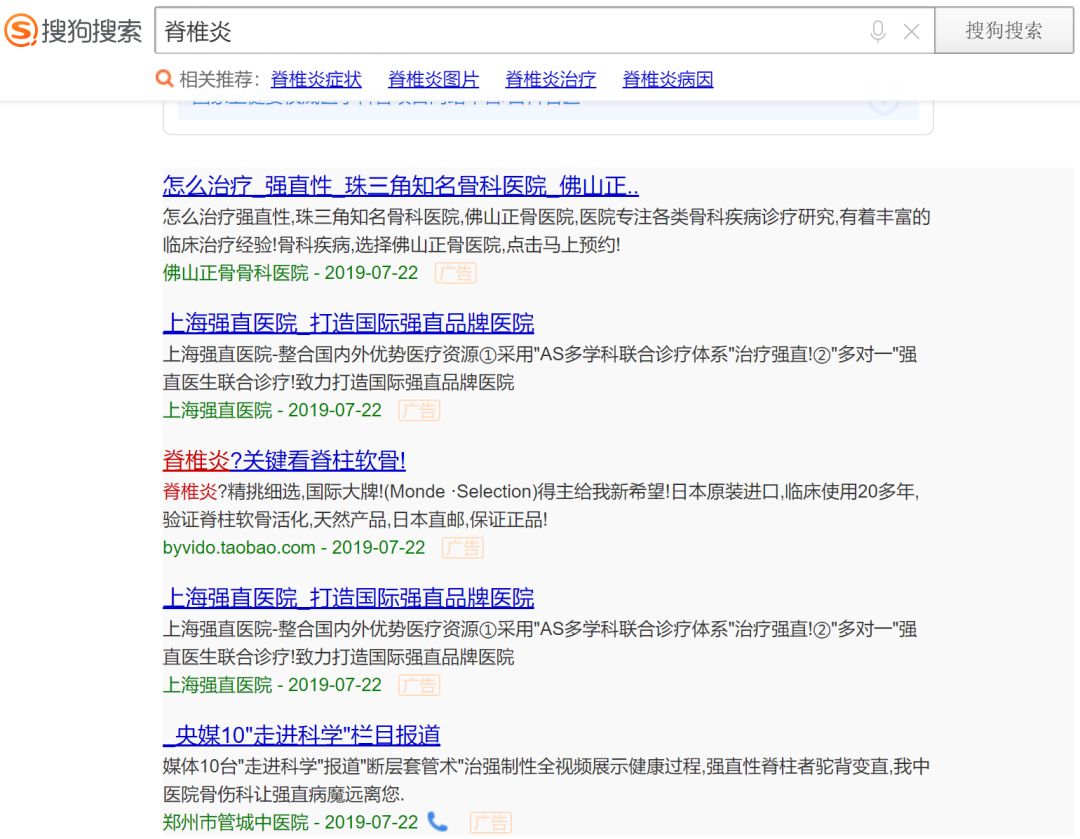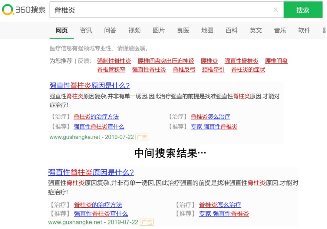 他们无一例外都在赚医疗广告的快钱,比如搜索“脊椎炎”,首页展示结果分别是: