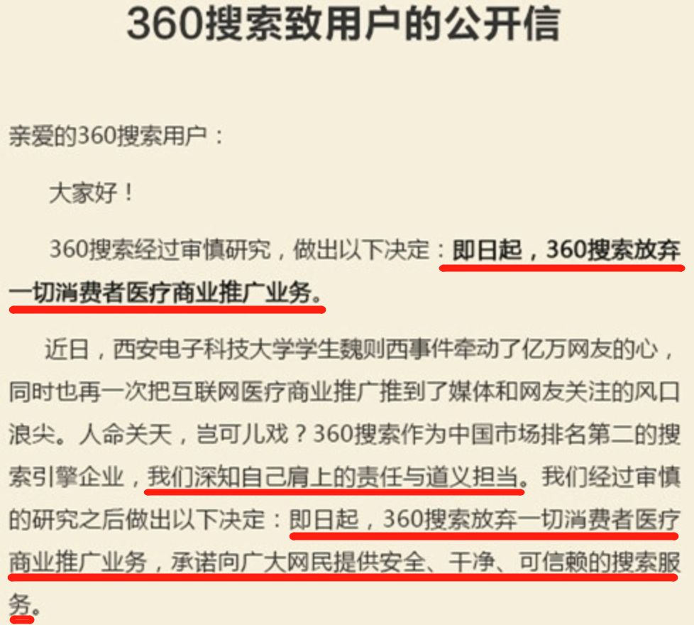 看起来360是最有节操的,其实一点也不,在魏则西去世的第二个月(2016年5月),360搜索曾发布过一则公告: