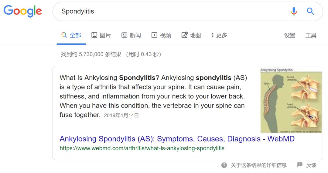 我又用脊椎炎的英文翻译 Spondylitis 进行搜索,一样没有广告。