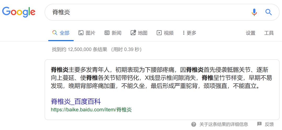 在谷歌搜索“脊椎炎”,搜索结果并没有广告(首页和翻页都没有),右侧空白区域也没有。