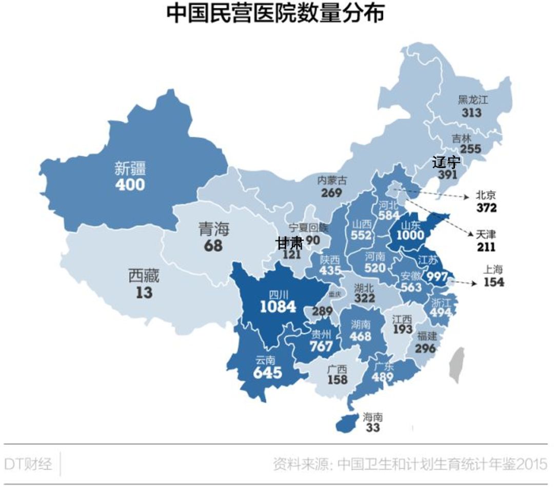 根据DT财经的数据,国内各省民营医院的分布如下: