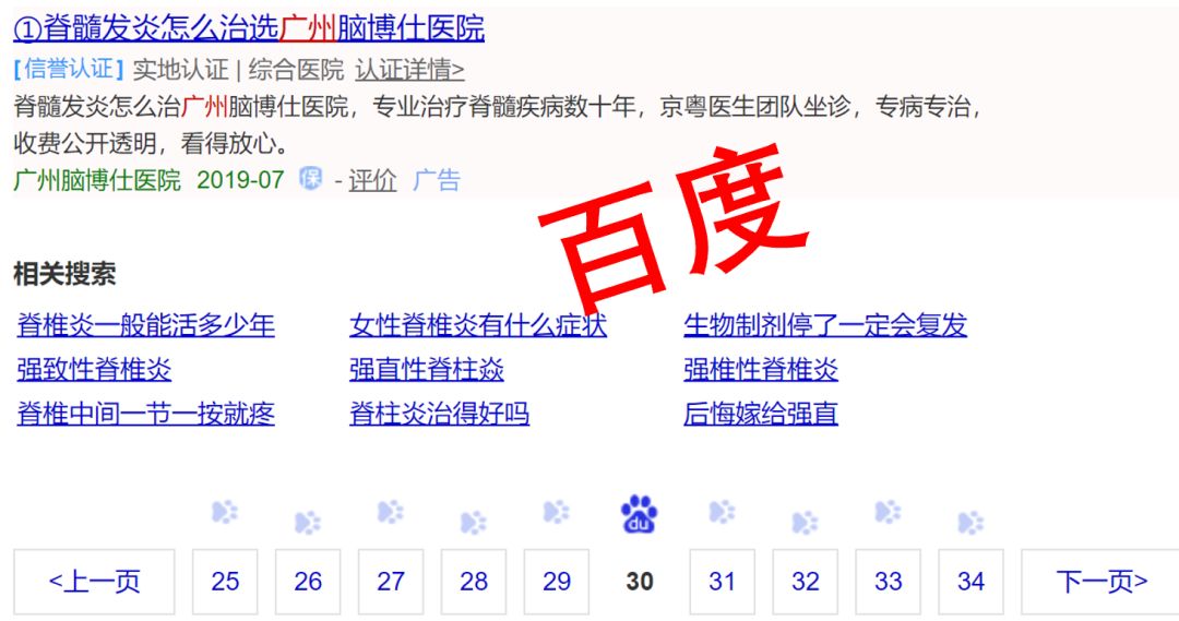百度是“前后包抄型”,第一位和最后一位是医疗广告。
