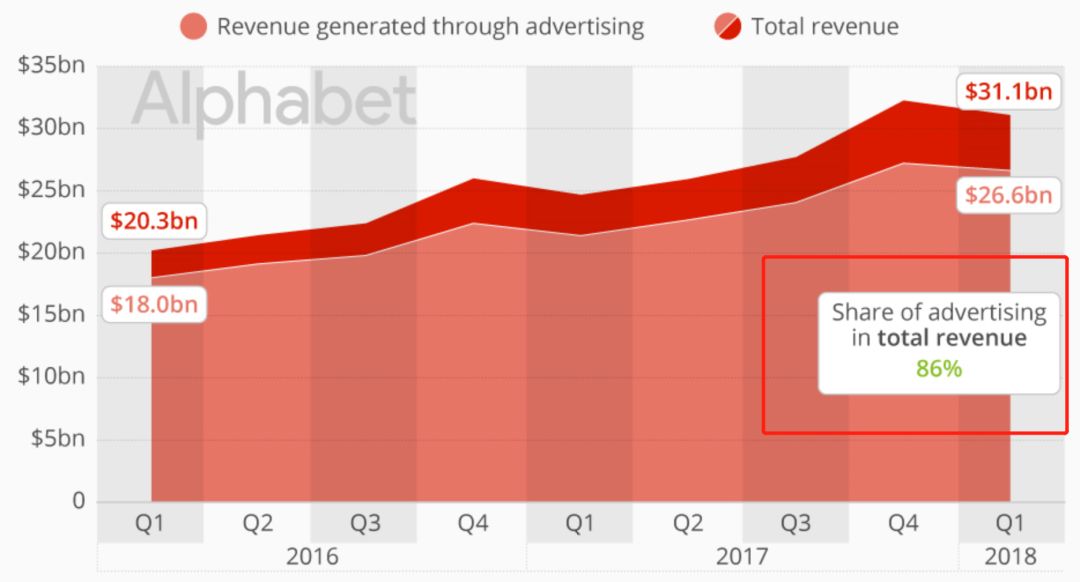 难道谷歌不怎么依赖广告收入?当然不是,谷歌母公司Alphabet的财报显示,其广告收入占比总营收高达 86%,比百度还高。