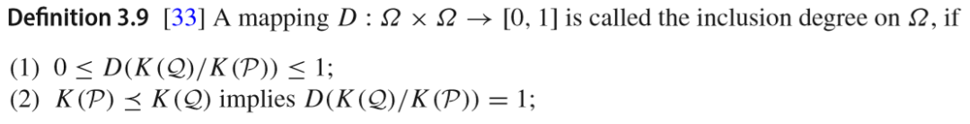 Inclusion degree(是一种衡量inclusion relationship质量的标准),以下定义给出了两个集合向量之间的Inclusion degree(3.9取值范围及定义,3.10计算方式):