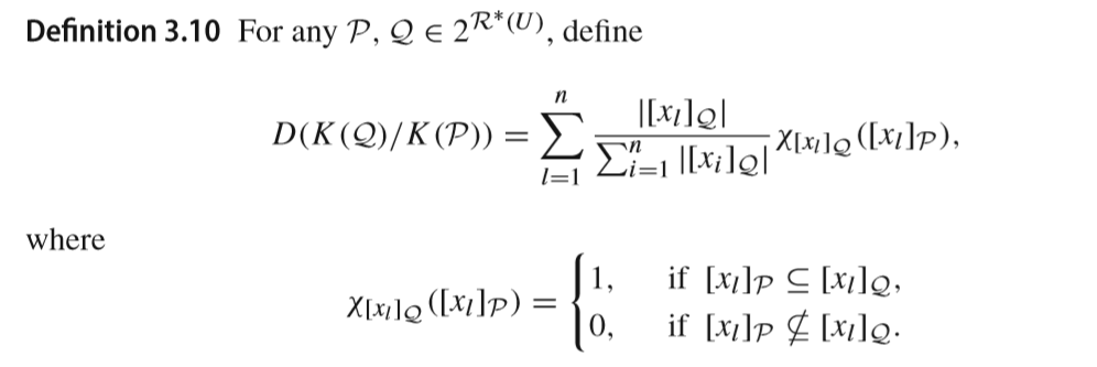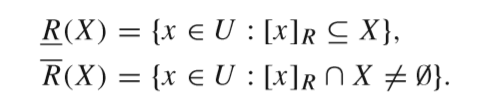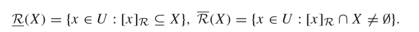 2.1当R是U的一个equivalence relation,那么(U, R)被视作一个Pawlak近似空间(这里需要对粗糙集的概念做一个初步了解),在此基础上,X∈2U(U的所有子集的族)的近似上下界可以通过以下公式定义: