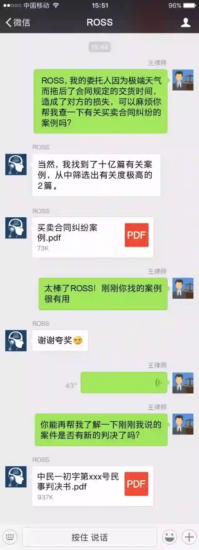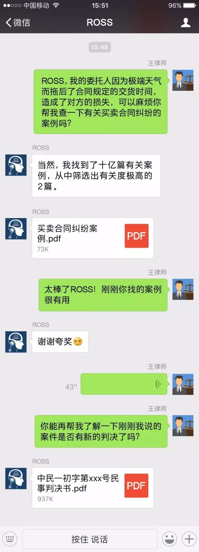 律师与ROSS像普通同事一样对话,ROSS能查询法律条文,并通过引用相关的立法文献、判例法或其他文献来让律师很快地了解最新情况。