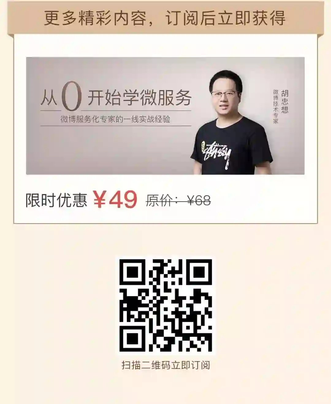 《从 0 开始学微服务》专栏全集已经更新完毕,作者胡忠想,微博技术专家,2012 年加入微博,一直在做微博首页信息流相关业务开发。这期间不仅参与了微博后端架构从大的单体应用迁移到微服务架构的改造,还作为主要负责人之一,主导了微服务架构在公司多个业务线的推广和落地,在专栏中会详细分享他在微博微服务架构方面的实践经验。专栏原价¥68,限时优惠只需¥49,仅限今天。
