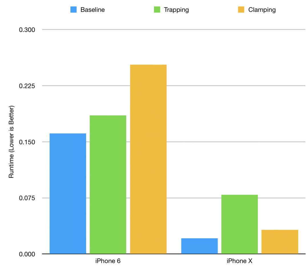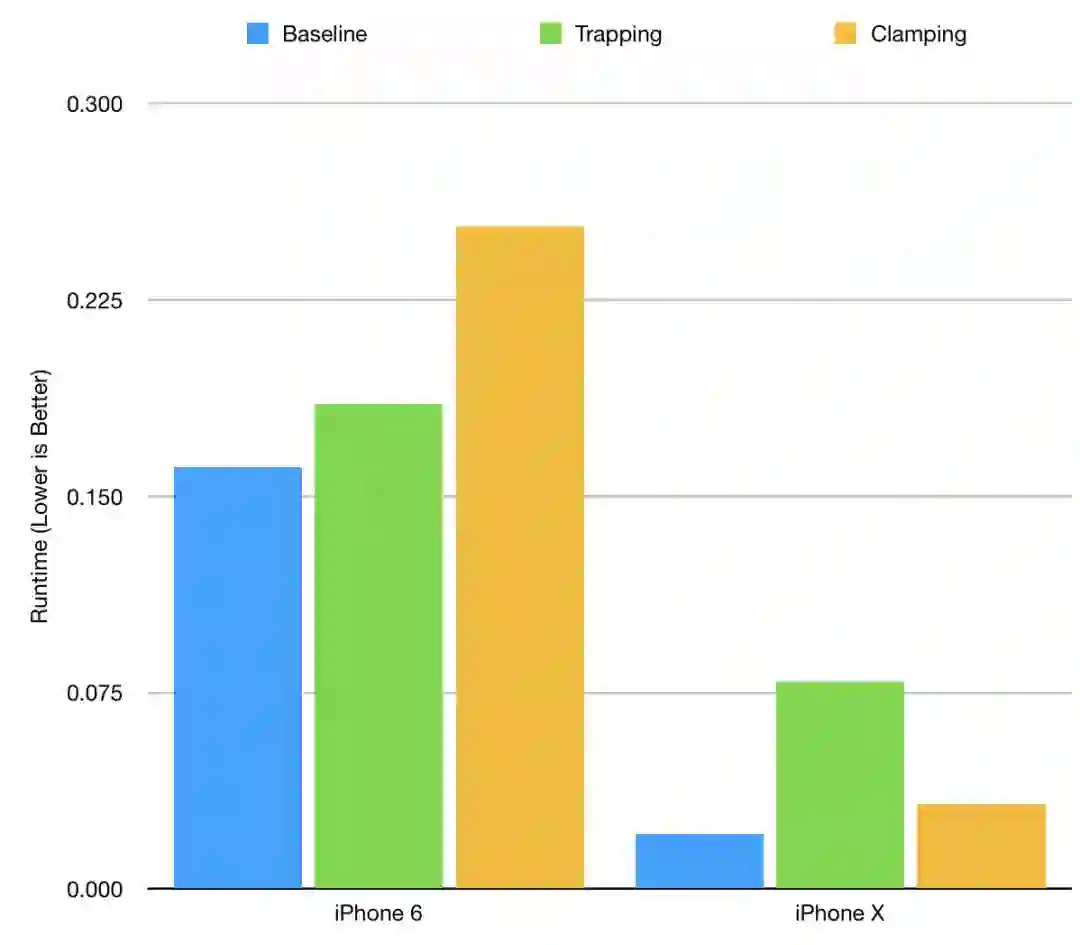 我们希望 trapping 能够更快,因为下游编译器可以消除冗余的 trap。但我们发现,在某些设备上,trapping 明显快于 clamping,而在其他设备上,却是反过来的。这些结果表明,编译器应该能够为特定设备选择更合适的方法,而不是被迫选择一种给定的方法。