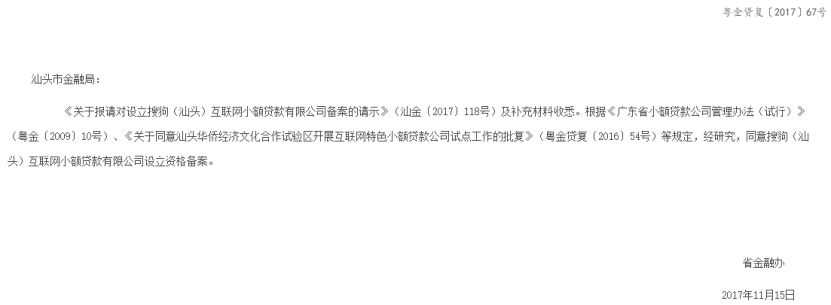 果不其然,第二次的尝试——“一点分期”悄然而至。子公司搜狗(汕头)互联网小额贷款有限公司在2017年11月15日取得广东省金融办的备案批文,由此而合规化。