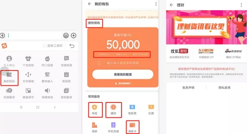 而这一次,搜狗把眼光瞄到了用户流量巨大的“搜狗手机输入法”,开始了第三次尝试。毕竟坐拥4.43亿的日均用户,若不自取,岂不是白白挥霍家底?进入搜狗输入法里的“搜狗借钱”界面,可以看到,搜狗借款最高额度为5万,日息万三,借款期限3-12个月。