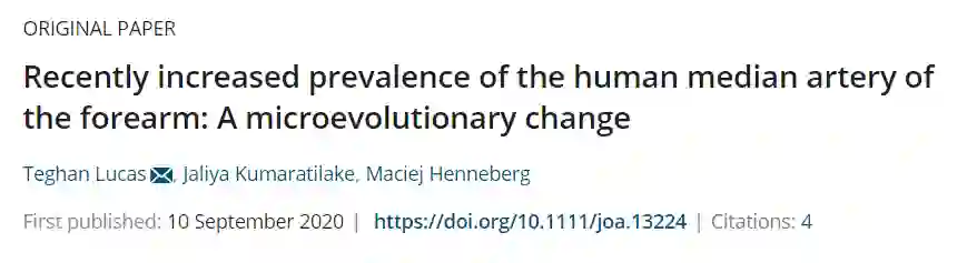 同时,他们还从此前发布的文献中发现,正中动脉在澳大利亚人群中留存的比例,从19世纪80年代中期的约10%,增加到了20世纪末的30%以上。