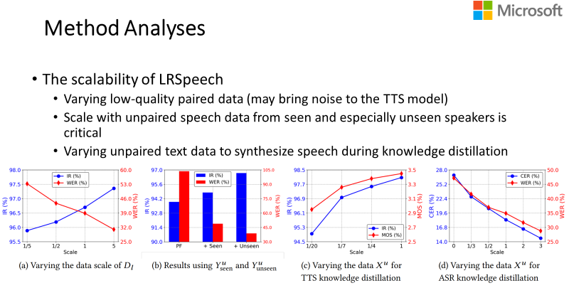 另外我们还做了一些其它详细的实验。比如图九(a)Dl 中指的是低质量多个说话者的语音,前面提到我们使用了1000条的数据量,我们做了一个实验来测试系统的敏感度,横轴1/5就是1000条的1/5——200条,5倍就是5000条。可以看到,随着数据量的增多,IR 和 WER 都变得越好。