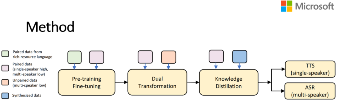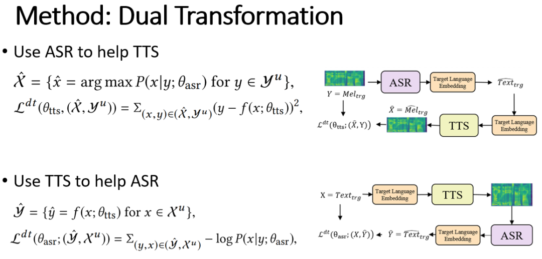 预训练和微调之后已经把极低资源场景下的一些成对数据用上了,但显然这是不够的,因为我们的成对数据很少,所以还需要一些不成对的语音以及文本,来进一步提高系统的性能。因此,接下来采用了对偶学习(dual transformation),这主要借鉴了微软亚洲研究院机器学习组在 ICML 2019 上发表的一篇文章——使用 TTS 和 ASR 系统彼此互相帮助来提高模型的性能,所以图三框图的地方可以看到上面有两个小框,是用上这个不成对的数据的。