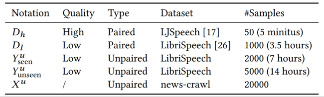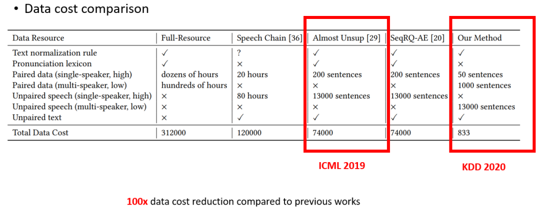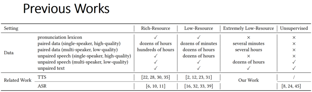其他的场景包括低资源以及无监督任务,同样会使用 grapheme-to-phoneme 转换和训练语料,但是训练语料会减少。然而包括 Rich-Resource 场景在内,他们都存在一些问题。Rich-Resource 需要大量的成对数据,尤其是高质量的单一说话者,这个数据的收集成本非常高昂。目前的低资源(low-resource)场景仍然需要较高的代价,而且低资源和无监督场景的准确率也并不能满足要求。所以我们论文的定位,就是做极端低资源场景下的工作,尽可能使用较少的数据,建立出一个满足要求的 TTS和 ASR 系统。(点击阅读原文,查看论文细节)