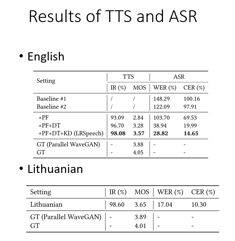 在英语上做完实验之后,我们在真实的低资源语言立陶宛语上做了实验,可以看到在立陶宛语上,IR 超过98%,MOS 是3.6,也是满足要求的。