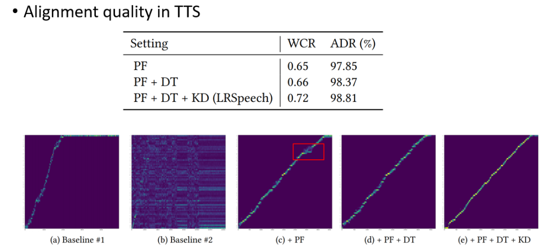 后面是一些更加细致的探究实验。比如,前面提到的 WCR、ADR 指标,每一个模块对指标都有提高吗?我们再回顾一下,WCR 是漏词的比例或者漏词的分数,可以理解为分数越高,这个句子越不容易漏词。ADR 越高,文本和语料对齐越好,这个声音越流畅。