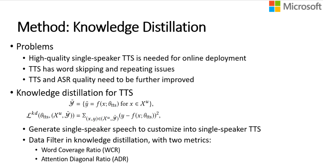第三部分是知识蒸馏。通过上一步的训练之后,我们已经有了一个效果不错的 TTS 和ASR 系统,但 TTS 系统仅仅通过上面两步的 TTS 和 ASR 系统还存在一些跳词和漏词的问题,质量还不能满足要求。