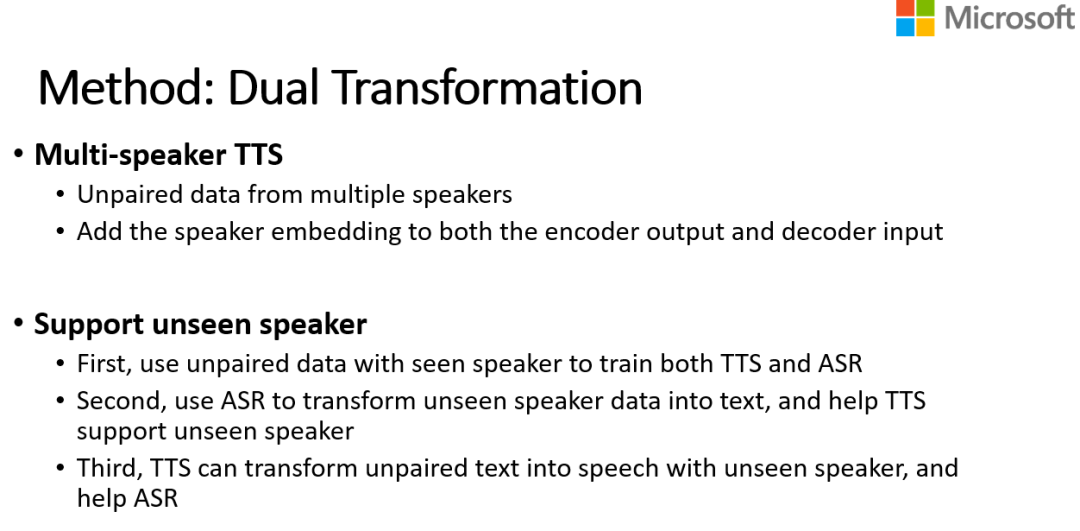 我们首先用 ASR 系统将没有见过的说话者的语音转化成文本,然后再用这种合成的成对数据去训练 TTS,这样 TTS 就能适应没有见过的说话者了。然后再用 TTS 来帮助 ASR。这种方式的好处是对于不成对的语料是不受限制的,可以搜集更多不成对的语料来帮助提高系统。