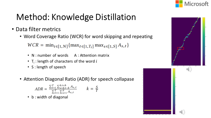这个原理是,我们使用 TTS 模型基于文本生成语料,然后再用 Student TTS 模型,但直接这样的训练是你的 Student 模型会去模仿 Teacher 模型,而没有办法克服 Teacher 模型的问题。所以我们提出了两个衡量指标来对这些数据进行筛选,使用筛选过的数据训练 Student,这样就可以保证 Student 模型的效果。第一个衡量指标叫 WCR(word coverage ratio,词覆盖率),这个指标是为了克服词里面跳或者漏的问题。