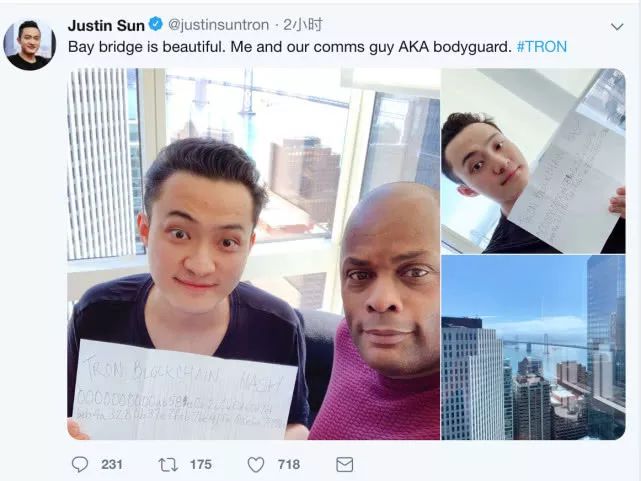“Bay Bridge很漂亮,我和我们负责沟通的伙伴,也是我的保安。”孙宇晨在7月23日中午在社交媒体上称。