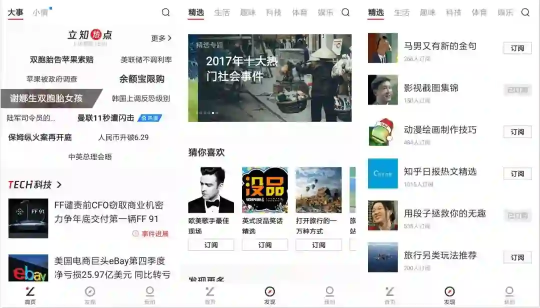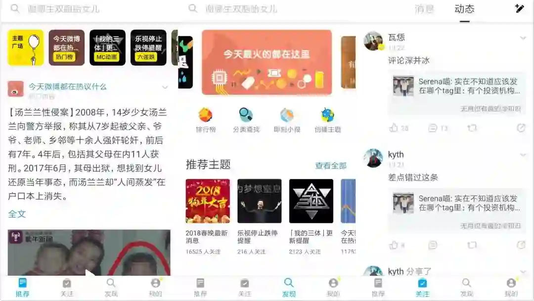 比如,首页的“立知热点”,包括“谢娜生双胞胎女孩”、“保姆纵火案再开庭”等具体事件。用户可在“发现”Tab,自行订阅细分主题,不是频道,也不是标签。而是这种:马男又有新金句、科技大佬互怼了、微博热搜整改风波追踪……