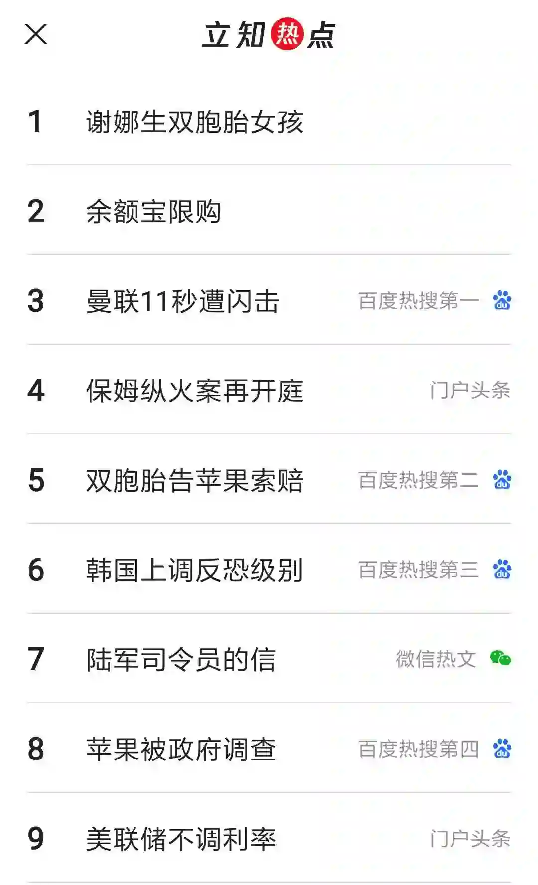 这部分两大块:一是“立知热点”,多个新闻热点以短标题的形式排列,颇像一个摊开来的微博热搜。实际上,点击“更多”进去,它的确是一个热搜榜。厉害的是,它集百家之长,抓了百度热搜、门户头条和微信热文的信息源。