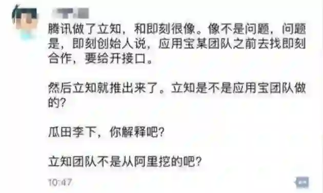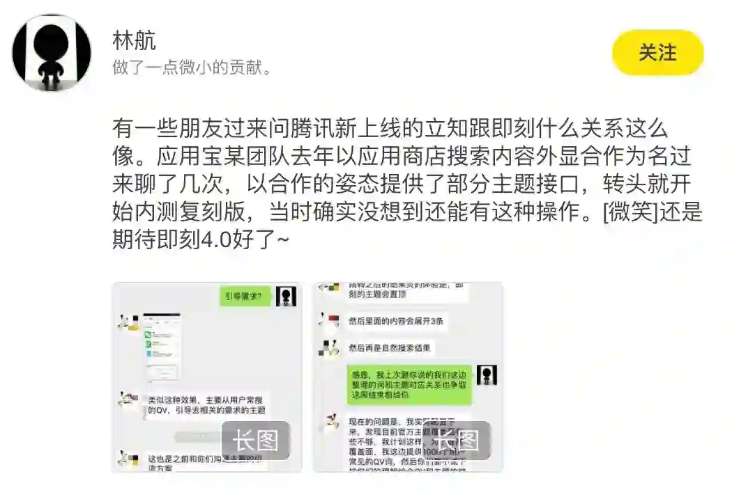 果然不久之后,即刻联合创始人林航就发声了:应用宝某团队去年以应用商店搜索内容外显合作为名过来聊了几次,以合作的姿态提供了部分主体接口,转头就开始内测复刻版,当时确实没有想到还能有这种操作。