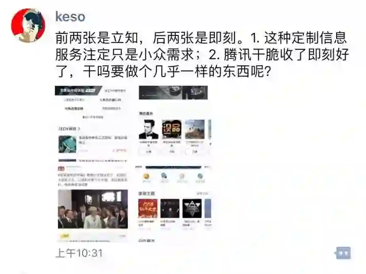 到这里你可能就发现了,一旦谈到人,即刻的领先就只是“暂时”的了。腾讯没有兴趣的基因,可它有社交的基因。拿着这张王牌,它几乎可以奇袭任何领域。