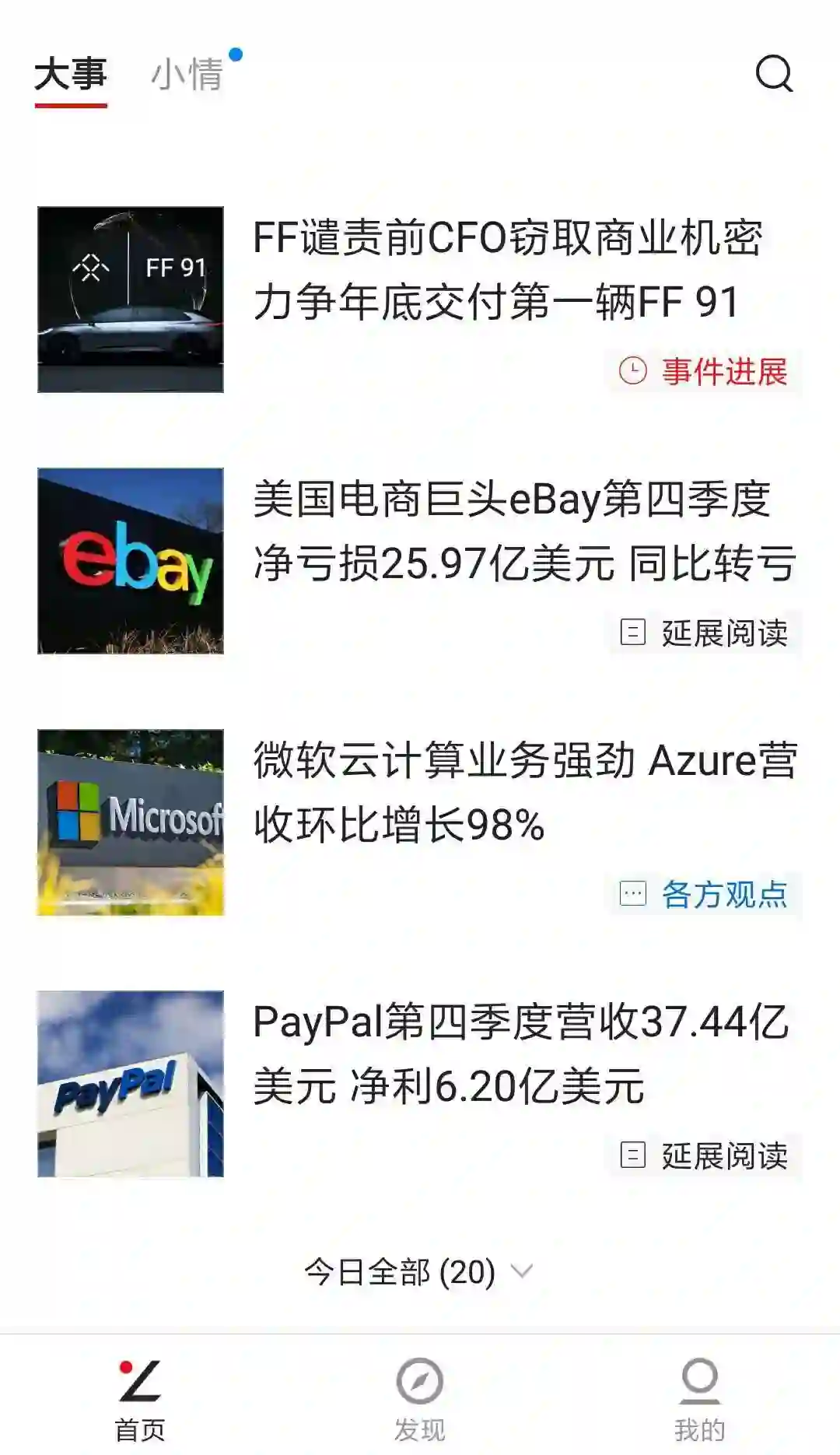 二是“今日大事”,分科技、娱乐、财经等5个频道,每个频道展现20条左右新闻。根据新闻标题右侧的标签来看,具体的信息呈现方式又有三种:延展阅读、各方观点和事件进展。