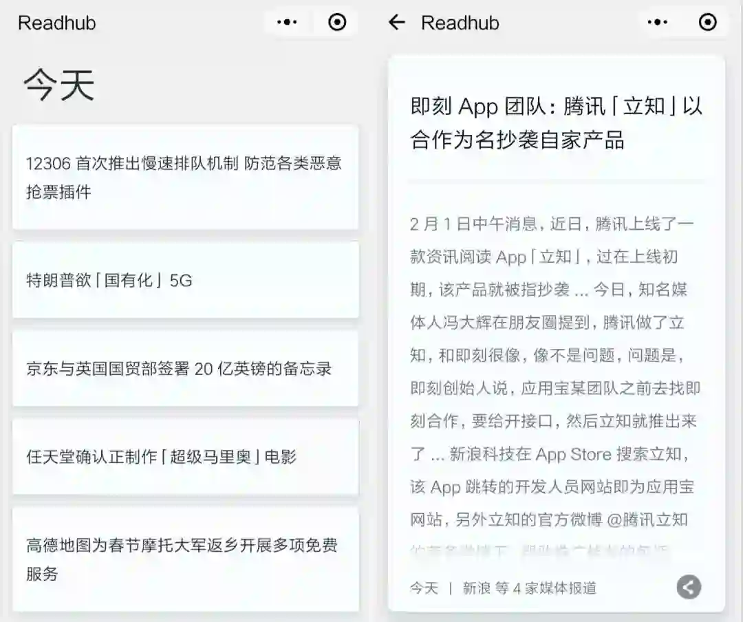 熟悉的配方,熟悉的味道。有人敏锐地发觉,这不就是“小道消息”的Readhub吗?不得不说,虽然冯大辉老师做了一年医疗搜索,都没看见产品,但这个专注科技资讯的小程序,还是做的相当赞的。